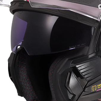 - Interne rauchfarbene Sonnenblende mit Kratzer- und UV-Schutz, die über einen Schieber unten links am Helm aktiviert wird.